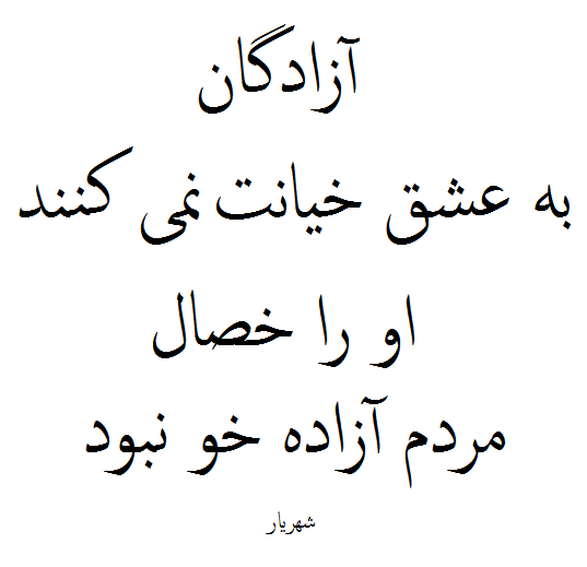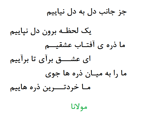 ای که می پرسی نشان عشق چیست عشق چیزی جز ظهور مهر نیست عشق یعنی مشکلی آسان کنی دردی از درمانده ای درمان کنی در میان این همه غوغا و شر عشق یعنی کاهش رنج بشر عشق یعنی گل به جای خار باش پل به جای این همه دیوار باش عشق یعنی تشنه ای خود نیز اگر واگذاری آب را، بر تشنه تر عشق یعنی دشت گل کاری شده در کویری چشمه ای جاری شده عشق یعنی ترش را شیرین کنی عشق یعنی نیش را نوشین کنی هر کجا عشق آید و ساکن شود هر چه ناممکن بود، ممکن شود