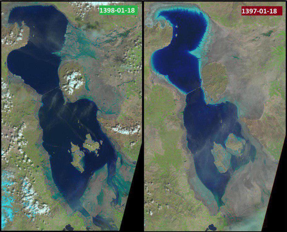 مقایسه ی عکس های ماهواره ای دریاچه ی ارومیه نشان می دهد